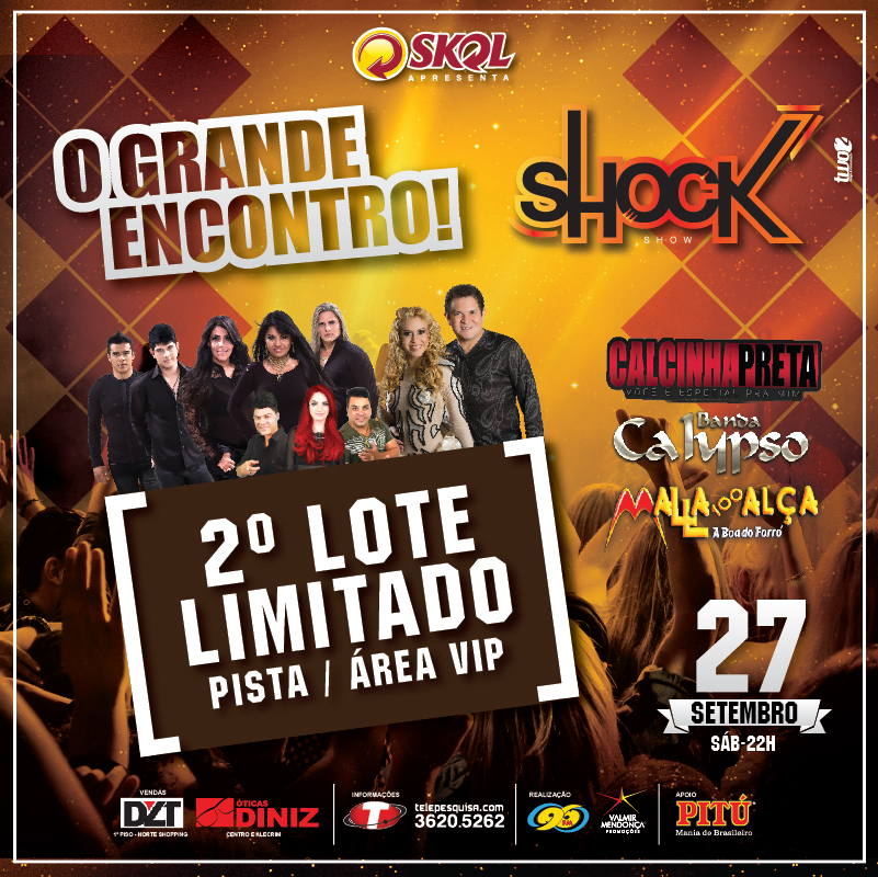 O GRANDE ENCONTRO! Todos os caminhos te levam para a @shockcasashow! 27/SET: CALCINHA PRETA + CALYPSO + MALLA 100 ALÇA. 2° lote - Vendas: DLT (Norte Shopping) e Óticas Diniz (Centro e Alecrim) Informações: @telepesquisa 3620-5262