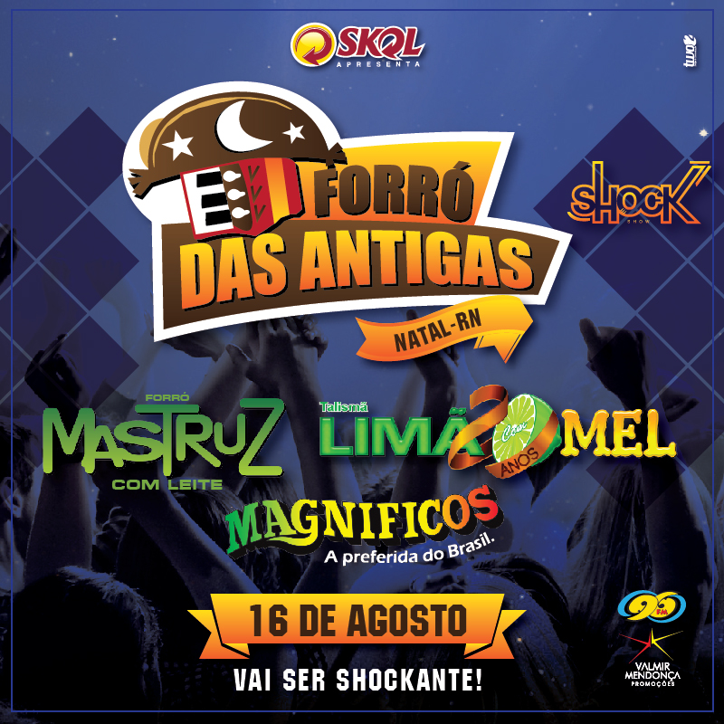 A espera acabou! Dia 16 de agosto é o nosso encontro na casa mais shockante do RN! Valmir Mendonça Promoções e Skol apresentam: Limão com Mel, Mastruz com Leite e Magníficos no Forró das Antigas. Mais informações como ponto de venda e valores em breve nas redes sociais @shockcasashow, @valmirmendoncapromocoes e @96fmnatal. #VaiSerShockante!