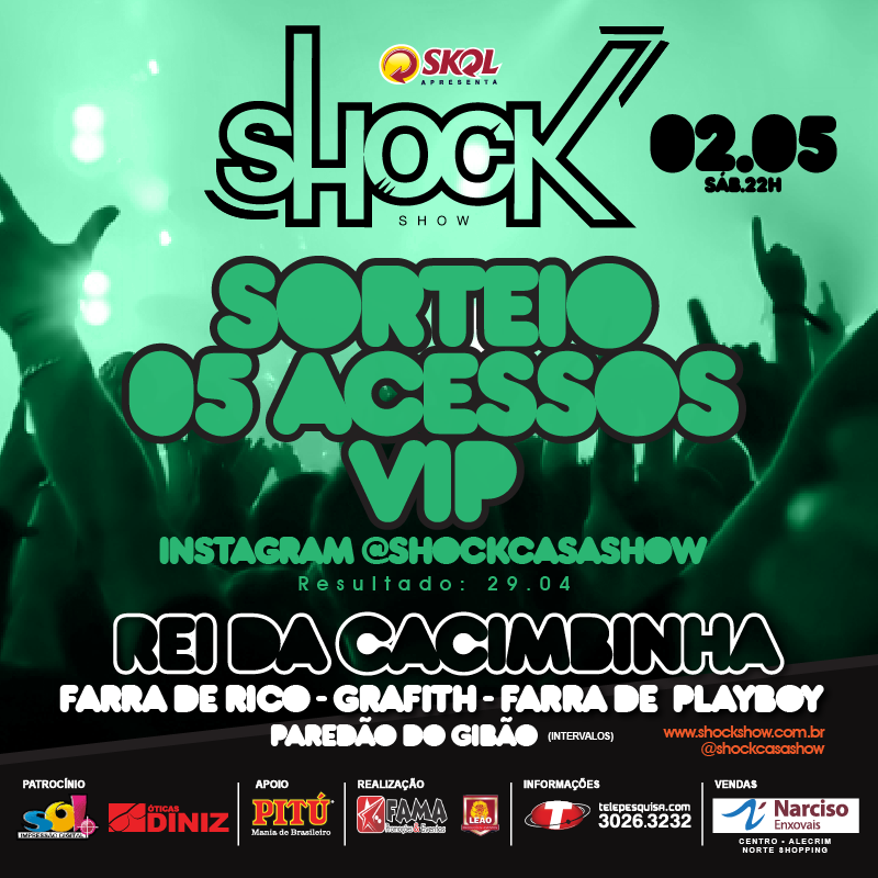 Acesse nosso Instagram @shockcasashow e confira a publicação promocional dessa image. Serão 05 sorteados(as) com direito a acompanhante. Resultado: 29.04 (quarta).