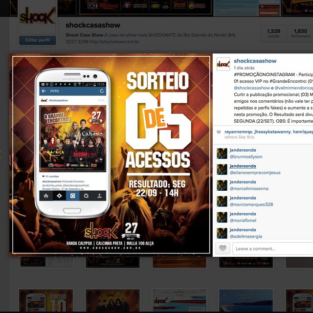 Participe e concorra a 01 acesso VIP no #GrandeEncontro. Verifique a publicação promocional em nosso Instagram (@shockcasashow), siga toda as regras e boa sorte! Serão 05 sorteados na próxima segunda (22). #Participe #PromoçãoNoInstagram
